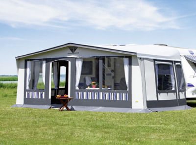 Besonderheiten: abgedeckte Reißverschlüsse, senkrechte & waagerechte Hohlsäume für Zusatzstangen in den Wänden, doppelter Erdstreifen (innen und außenliegend), individuelle Bodenabspannung, zweites Kederband für die schraublose Befestigung (Vario Clip - Sonderzubehör) am Wohnwagen, verschließbare Hochentlüftung.