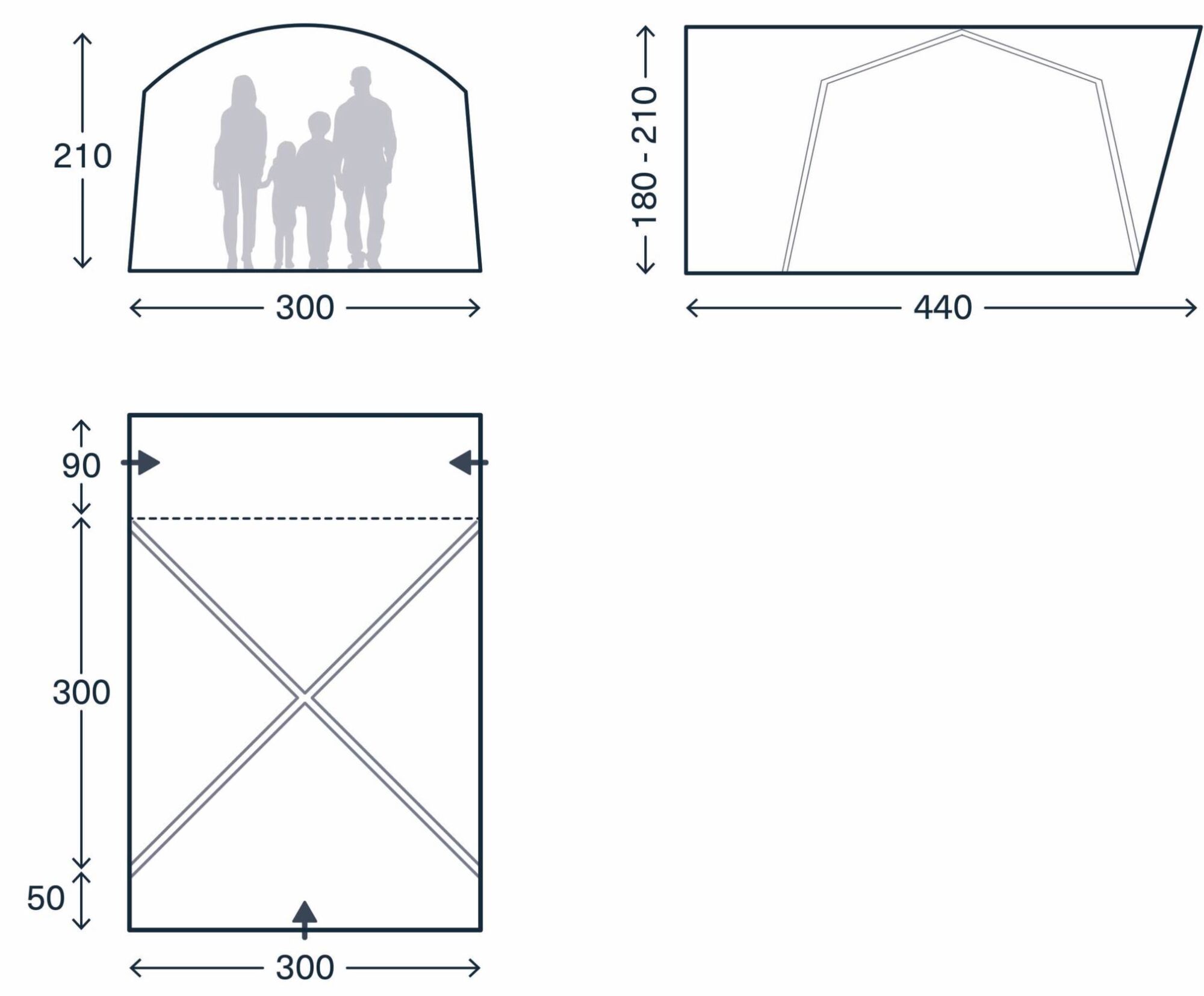 Abmessungen: 300 x 300+90 (Schleuse) x 210 cm (B x T x H)