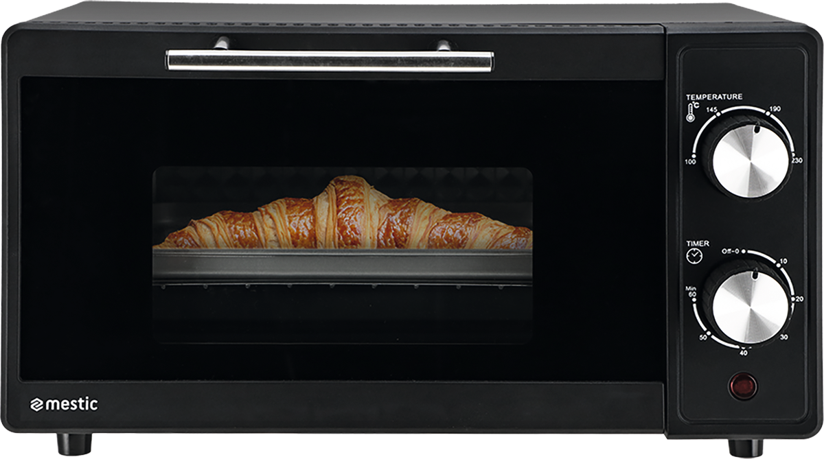 Der kleine Backofen verfügt über vier Heizstufen: Oberhitze, Unterhitze, Ober- und Unterhitze und Heißluftheizung. Da der Backofen über ein Gebläse verfügt, wird Ihr Aufbackbrot von allen Seiten schön knusprig. Die Tür ist isoliert und doppelt verglast. Mit dem Drehknopf können Sie die Temperatur ganz einfach auf bis zu 230 °C einstellen. Der Backofen ist mit einer eingebauten Timerfunktion von bis zu 60 Minuten, einem Überhitzungsschutz, einem Grillrost, einem Backblech und einer herausnehmbaren Krümelschublade ausgestattet.