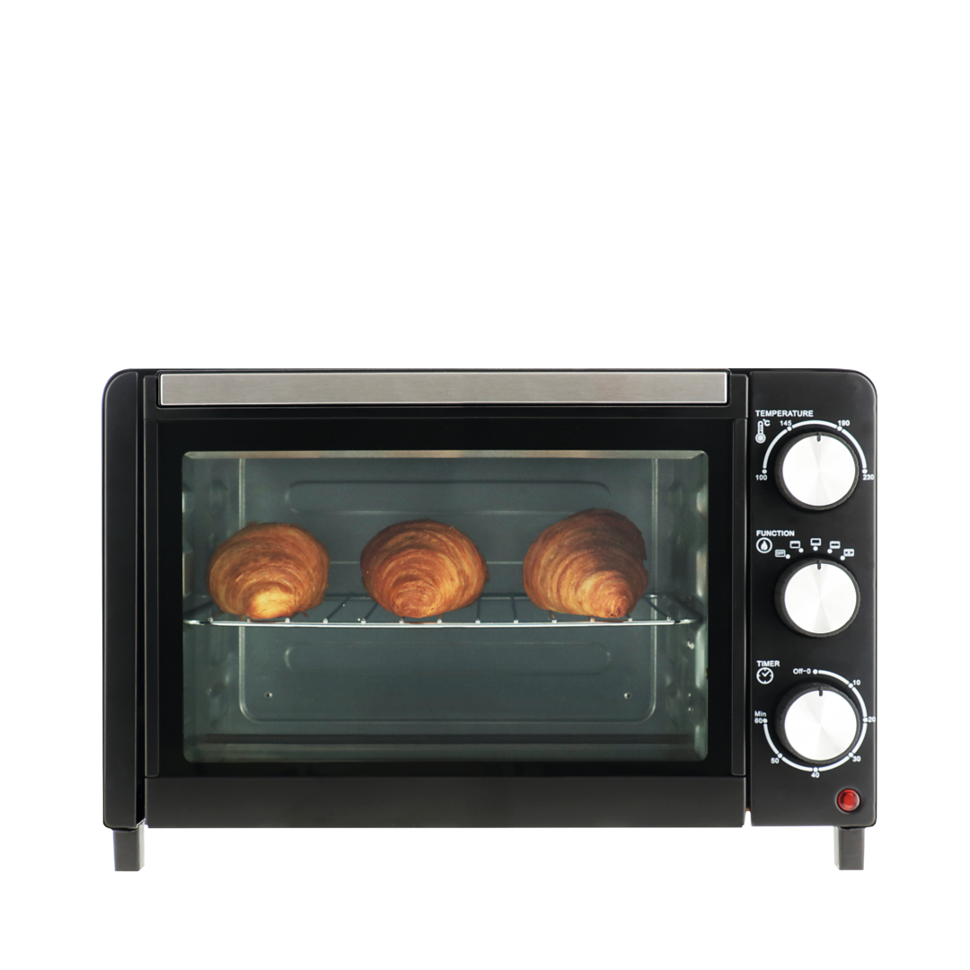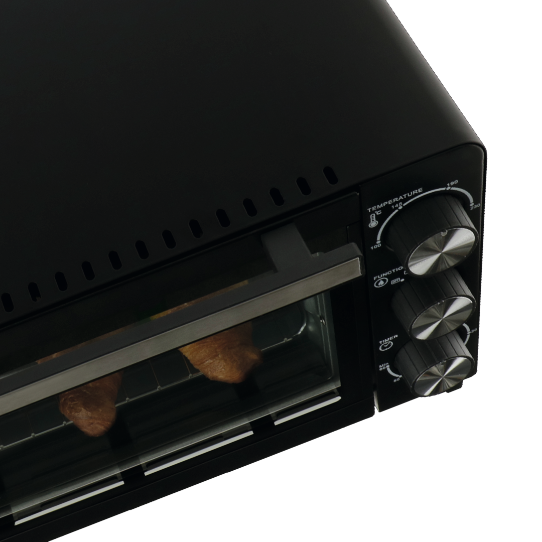 Der kleine Backofen verfügt über vier Heizstufen: Oberhitze, Unterhitze, Ober- und Unterhitze und Heißluftheizung. Da der Backofen über ein Gebläse verfügt, wird Ihr Aufbackbrot von allen Seiten schön knusprig. Die Tür ist isoliert und doppelt verglast. Mit dem Drehknopf können Sie die Temperatur ganz einfach auf bis zu 230 °C einstellen. Der Backofen ist mit einer eingebauten Timerfunktion von bis zu 60 Minuten, einem Überhitzungsschutz, einem Grillrost, einem Backblech und einer herausnehmbaren Krümelschublade ausgestattet.