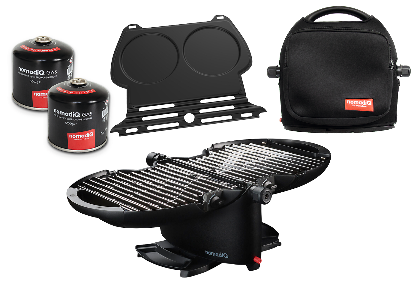 NomadiQ Kompakt-BBQ Gasgrill 3.0, BUNDLE: 2x Gaskartusche, Tasche & Pancake-Backblech